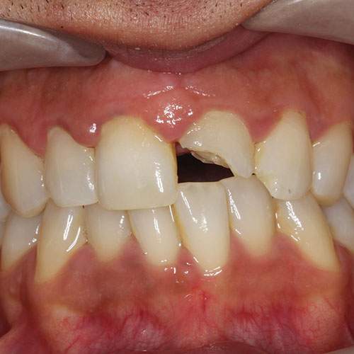 Clinical image pre-treatment: Buccal view of UR2 with a crown-root fracture. Labial fracture line is visible a few millimetres below the gingival margin.